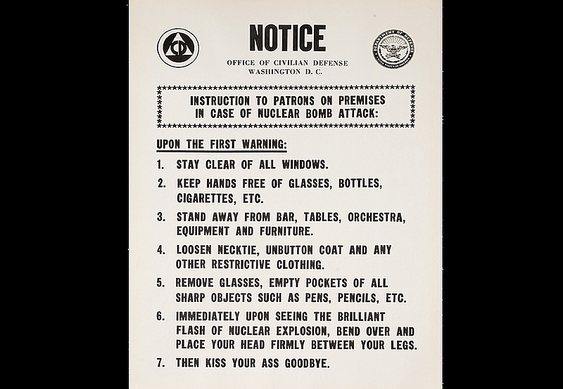 Acest articol mi-a adus aminte că am citit într-o carte (ce multe și minunate lucruri poți afla din cărți, singura condiție fiind să le citești) despre instrucțiunile afișate în adăposturile nucleare amenajate în America la începutul anilor ‘60. Puteți să vedeți un astfel de afiș în poza care ilustrează acest text, fiți atenți mai ales la punctele 6 șî 7, nu e o glumă.
