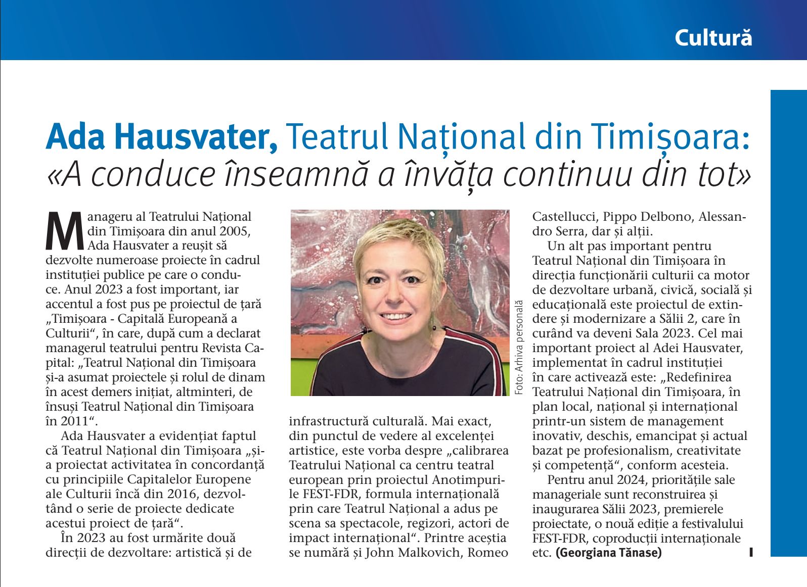 Ada Hausvater, directorul general al Teatrului Național „Mihai Eminescu” din Timișoara, a fost inclusă în Capital Top 100 Manageri, ediția 2024, o recunoaștere a excelenței sale în management. Această distincție vine ca rezultat al performanțelor notabile înregistrate în domeniul cultural.