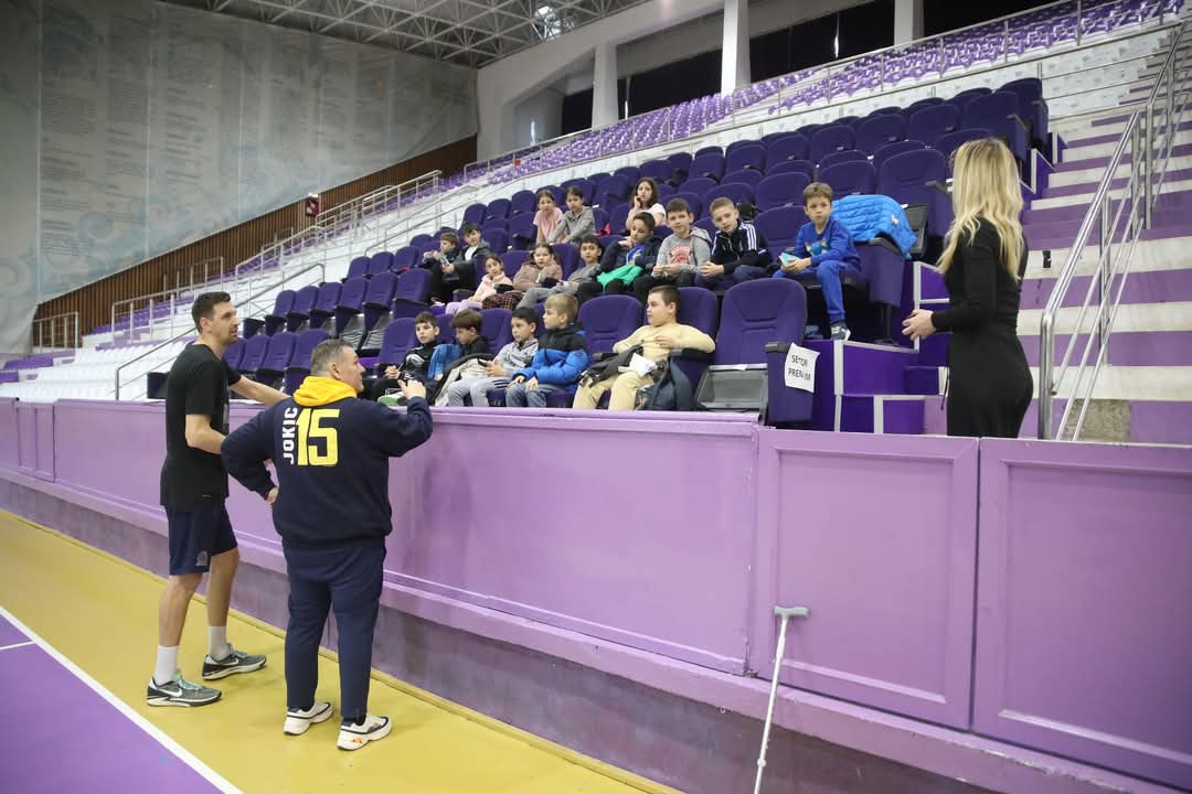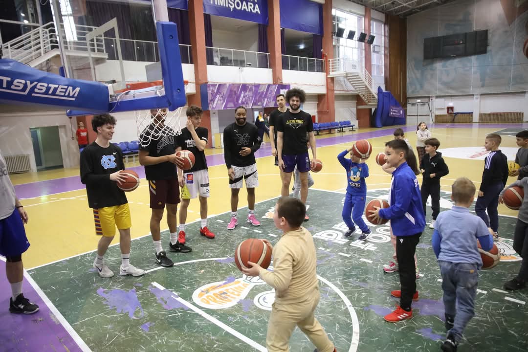 Căpitan și micuții săi elevi au asistat la antrenamentul echipei masculine a SCM Timișoara. Fascinați de schemele jucătorilor lui Dragan Petricevic, elevii nu au refuzat invitația făcută de căpitanul Laszlo Lazar pentru un concurs de aruncări, după care s-a trecut la sesiunea de autografe.