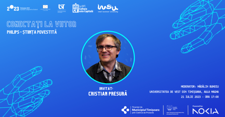 Universitatea de Vest din Timișoara (UVT) organizează un eveniment special în data de 21 iulie, sub numele de „Conectați la viitor”, cu scopul de a populariza știința. Acesta va avea loc în Aula Magna a universității începând cu ora 17:00 și va găzdui un invitat de prestigiu, fizicianul Cristian Presură.