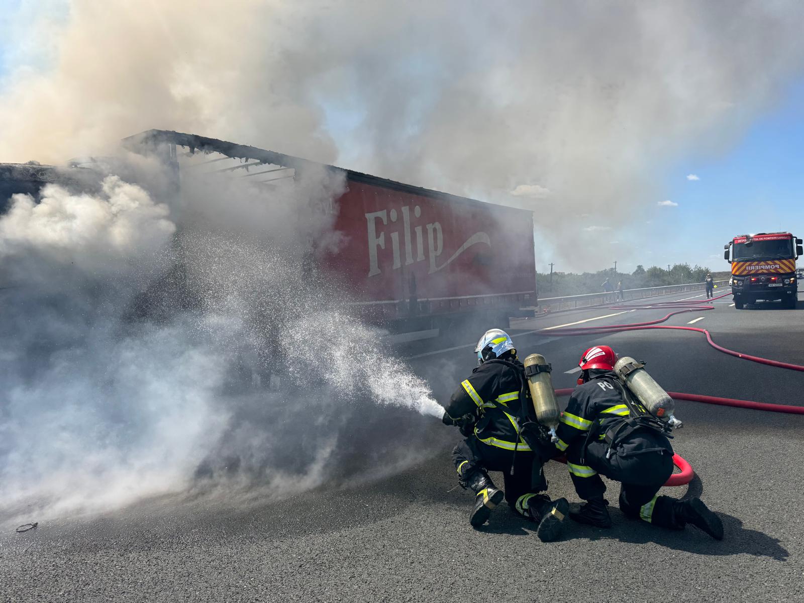 Luni, 25 august, un TIR care transporta componente metalice a luat foc pe A1, km 455, în apropiere de nodul cu A6, sens Timișoara-Deva. Șoferul a scăpat nevătămat, iar pompierii au intervenit rapid pentru stingere.