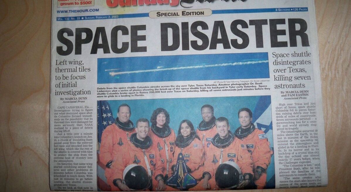 2003: Naveta americană „Columbia” se dezintegrează la reintrarea în atmosferă, la altitudinea de 63 km. Naveta, lansată la 12 aprilie 1981, se afla la a 28-a misiune. Și-au pierdut viața 7 astronauți (6 americani și unul israelian).