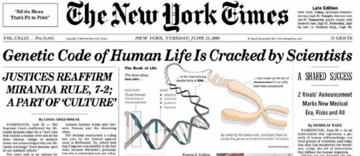 Pe 26 iunie 2000, omenirea a făcut un pas uriaș în înțelegerea propriei naturi: a fost anunțată finalizarea primei versiuni brute (sau „draft”) a secvenței genomului uman. Anunțul a fost făcut într-o conferință de presă comună de către președintele american Bill Clinton, liderii Proiectului Genomului Uman (HGP – Human Genome Project) și reprezentanții companiei private Celera Genomics, conduși de controversatul cercetător Craig Venter.