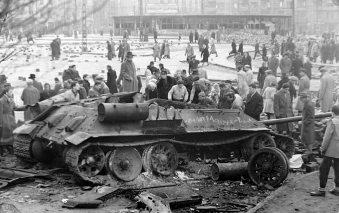La 23 octombrie 1956 sute de mii de oameni au cerut demisia guvernului bolșevic opresiv. Drapelul maghiar cu emblema comunistă a fost dat jos, iar spre seara zilei de 23 octombrie 1956, studenții de la Universitatea Tehnică au demonstrat pe bulevardul Jozef Bem, afișându-și solidaritatea cu manifestanții pro-Gomułka din Polonia. Foarte repede studenții au reușit să-i coopteze și pe alții, cu intenția schimbării demonstrației în protest. Mulți soldați maghiari s-au alăturat protestatarilor, scoțându-și steaua sovietică de pe șapcă. Fără a avea vreun lider, circa 100.000 de demonstranți au traversat Dunărea spre clădirea Parlamentului, manifestând pașnic. Situația s-a schimbat, însă, dramatic în momentul când trupele securității maghiare, numită (ÁVH), au deschis focul și au omorât sute de demonstranți.