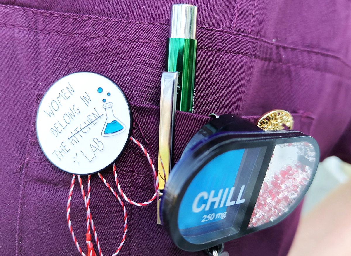 În timp ce ne luăm rămas bun, în fața Județeanului, mă mai opresc o clipă să-i pozez mărțișorul îndemn ce îi atârnă pe piept, cum încă suntem în luna fragilelor cadouașe ce se agață în șnur roșu cu alb. Dar aici nu este vorba despre fragilitate, neapărat, ci despre putere – a minții, a priceperii, a grației feminine. Ideea de demult, cu „femeia care trebuie să stea în bucătărie” e schimbat timpului din care facem amândouă parte și căruia îi arătăm ce putem: „femeia e de stat în laborator”. Așa e, stăm peste tot unde e făcut ceva interesant. Și nu doar stăm, sau aparținem de locul respectiv, ci schimbăm și contăm. Go, girl!