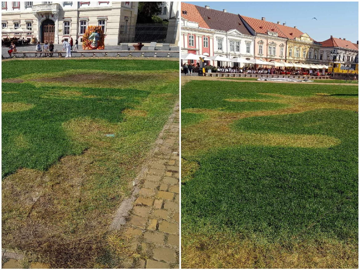 În weekend, Piața Unirii a găzduit instalația TIMISIEN, parte din a 18-a ediție a Festivalului PLAI. În urma dezinstalării corturilor din mijlocul pieței, însă, s-a descoperit că a fost afectat parțial și gazonul pe care acestea erau instalate. De refacerea suprafeței afectate ar trebui să se ocupe, acum, organizatorii festivalului.