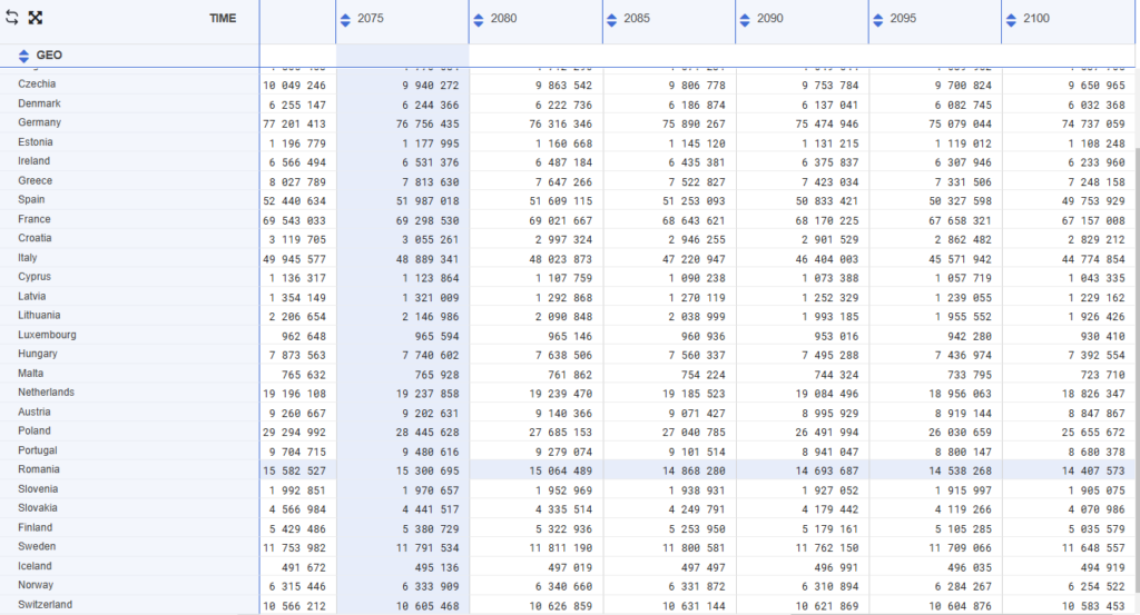 Fenomenul nu este singular în Europa, însă România se numără printre țările cele mai afectate. Potrivit estimărilor Eurostat, populația României ar urma să scadă de la aproximativ 19 milioane de locuitori în 2025 la circa 14,4 milioane în 2100. Asta înseamnă o pierdere de peste 4,6 milioane de persoane.