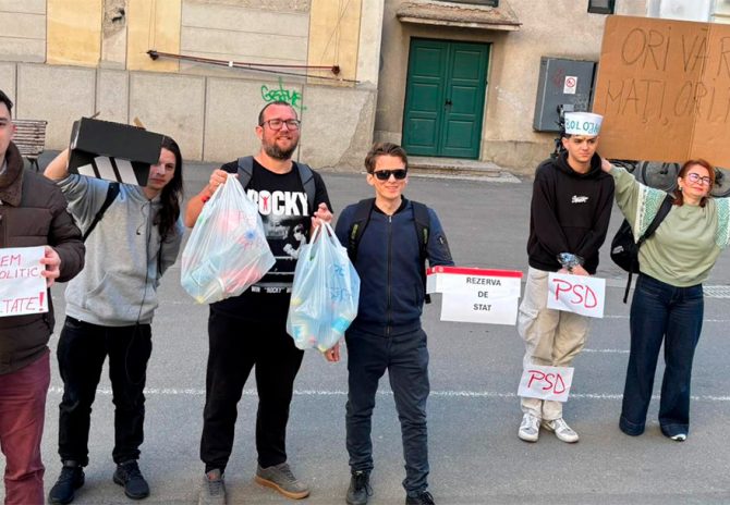 Protest inedit la Timișoara: Membrii Alternativa Civică au asediat conferința PSD cu cutii de pantofi și PET-uri. Activiștii acuză partidul că șantajează guvernul Bolojan pentru a-și păstra sinecurile și blochează reformele administrative. Vezi declarațiile dure ale protestatarilor.