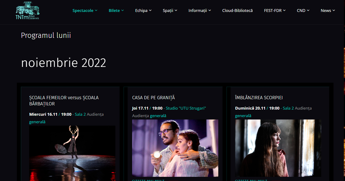 Teatrul Național din Timișoara și-a lansat noul website – www.tntm.ro. Site-ul, actualizat vremurilor moderne în care trăim, este noul instrument de comunicare online prin care utilizatorii pot accesa informații despre spectacolele Teatrului Național, despre evenimentele și despre inițiativele sale, despre echipă, despre sălile sale de spectacol etc., într-o formă optimizată, intuitivă, oferind o navigare prietenoasă pe orice tip de dispozitiv.